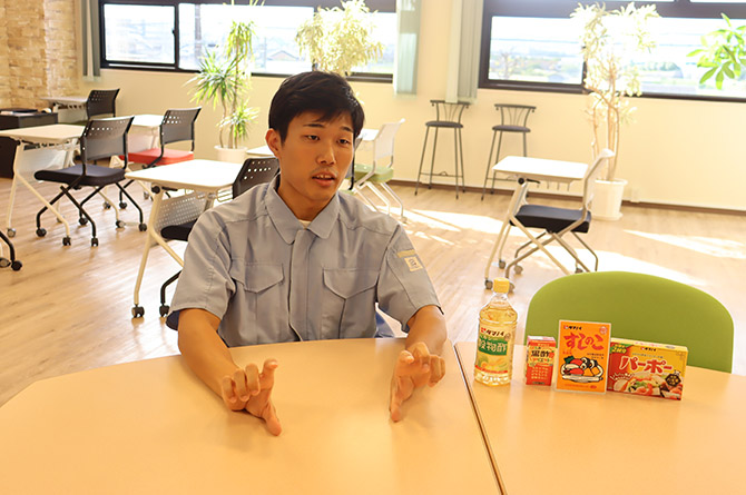 - お酢の素となる米粉からアルコールを作る工程を担当しています。製品の根幹となる部分のため、ここでトラブルが起きるとすべての製品づくりに影響してしまいます。安定して生産できるように支えることが、自分の役割であり、やりがいです。また、米粉や酢酸菌など天然の素材を扱うからこその面白さもあります。天然の素材は日によって反応が異なり、発酵の進み具合も変化します。しかし、その変化にどう対応するかを考えることが難しくもあり、学びの多いところです。