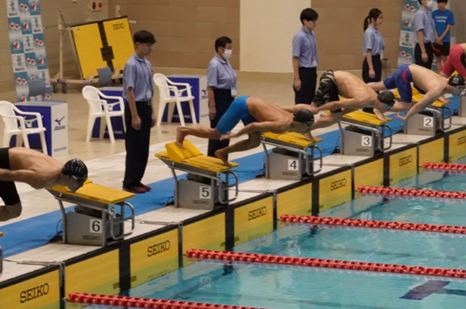 - 水泳に打ち込んでいました。授業以外はほとんどずっとプールで過ごしていましたね。水泳は個人競技なので、自分自身と向き合う力が磨かれたと思います。記録を伸ばすためには、筋力トレーニングやテクニックの習得、食事や休養の管理など、あらゆる面を継続的に追及する必要があります。そうした経験を通して、粘り強くやり抜く姿勢や、物事を多方面から考える力が身につきました。今の仕事でも、課題発見や問題解決に活かされていると思います。