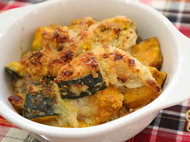 リンゴ酢とバターを入れた後に小麦粉を振り入れ、粉がなじんだら、牛乳を加え、とろみが出るまで混ぜ、塩、こしょうで味を調える。 - 3 皿にを(2)入れ、250℃のオーブンで15分程度焼く。